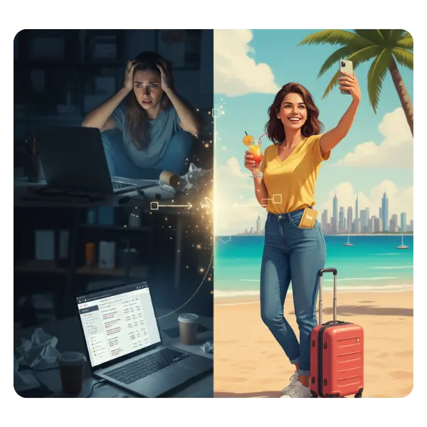 Teria que gastar horas pesquisando tutoriais aleatórios, cometendo erros e pagando caro em passagens, hospedagem e taxas ocultas.